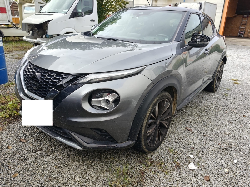 Nissan Juke uit 2022, grijs, benzine, 999 cc, diverse deuken, krassen en deuken in de carrosserie. Eén achteruitkijkspiegel is kapot. Enkele decoratieve elementen zijn verwijderd. 4 banden op de velg.
