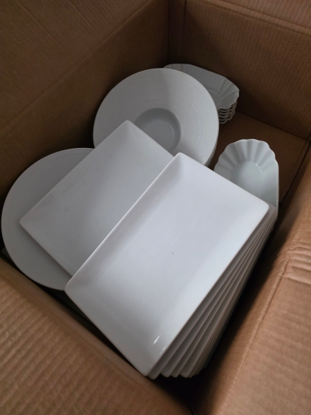 lot de vaisselle, verres et couverts (pour 40 couverts), 10 tables, 38 chaises, un lot d'ustensiles de cuisine professionnels (poêles, casseroles, passoires,...) (+/- 50 unités), une petite friteuse DIAMOND