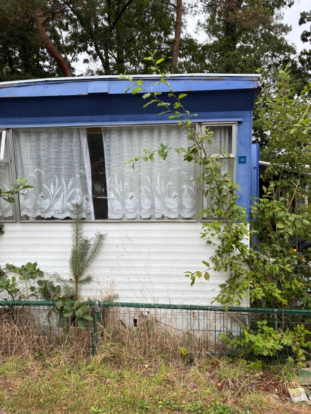 Stacaravan met living, toilet, wasruimte en slaapplaats (in zeer slechte staat)