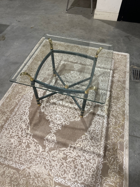een vierkante bijzettafel van glas met een groene metalen structuur